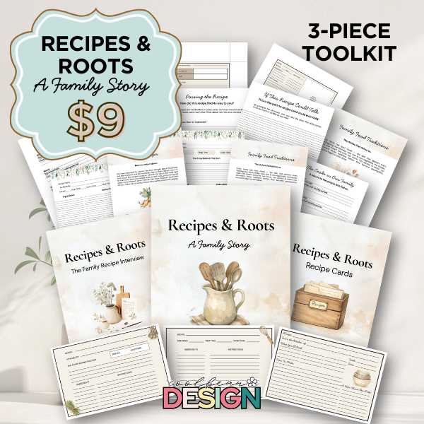Recipes & Roots: A Family Story Toolkit is a done-for-you Canva template kit that gives your audience everything they need to preserve not just the recipe, but the story behind it.